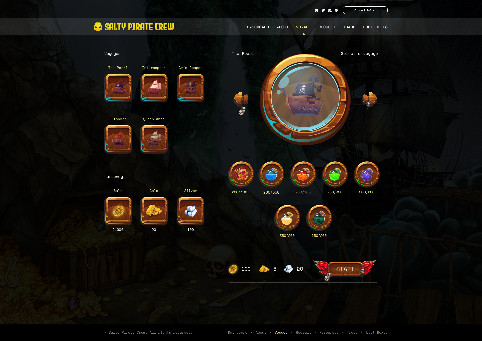 There are 5 captains and their ships you'll be able to go on a quest with. Earn enough resources to board the ship and return with a share of the loot. Collect the items from quests to mint a free pet.
